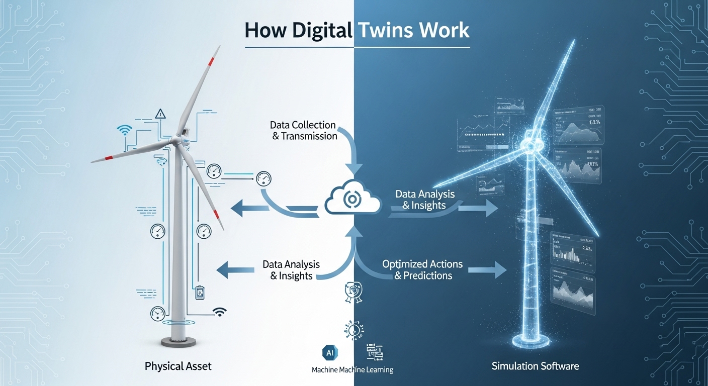 The twin does not simply store data but processes it, allowing users to analyze performance, run predictive simulations, and even test scenarios without interfering with the actual object. For example, engineers can test how an engine would perform under extreme stress conditions using its digital twin without risking the real engine. This combination of data integration, simulation, and feedback makes the digital twin far more powerful than a static model.